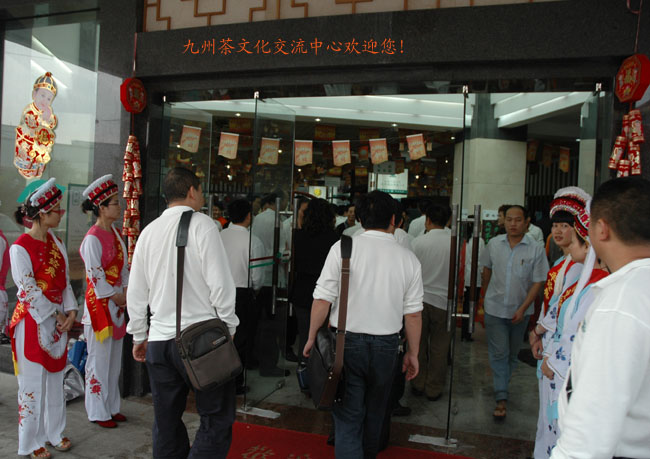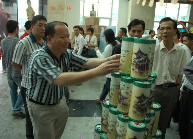 下午2點(diǎn)半,在九州茶文化中心舉行隆重的“下關(guān)沱茶首發(fā)上揭彩儀式”,在四面八方趕來的茶友們期待的眼光中和熱烈的掌聲中,下關(guān)沱茶集團(tuán)公司羅董事長, 陳總經(jīng)理和華爾佳茶業(yè)連鎖有限公司趙董事長一起為“寺登下關(guān)沱茶首發(fā)式”揭彩。